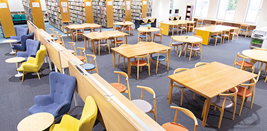 専門書をはじめ、文芸書や各種雑誌も充実の図書館。明るい閲覧スペースには、ビデオ、DVD、CDなどを視聴できるAVプライベートブースやインターネットブースもあります。