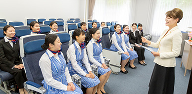 実際に飛行機内で使用されたシートを配置したエアライン教室では、臨場感あふれる授業でエアライン業界を目指す学生のやる気と集中力を高めます。