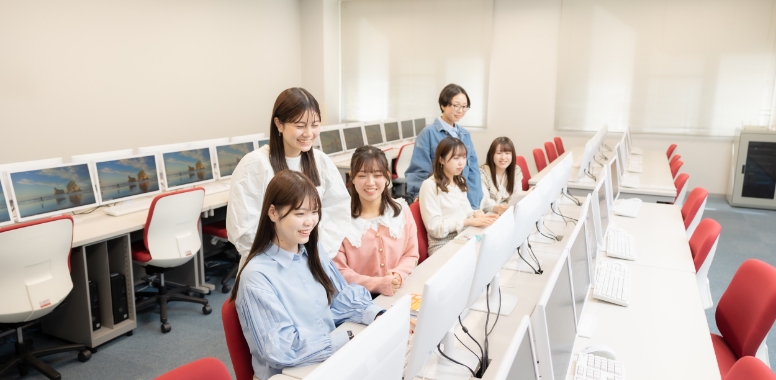2つのパソコン教室には、インターネット接続したパソコンを80台設置。学生一人ひとりにメールアドレスを与えています。授業以外でも、空き時間には自由に利用できます。