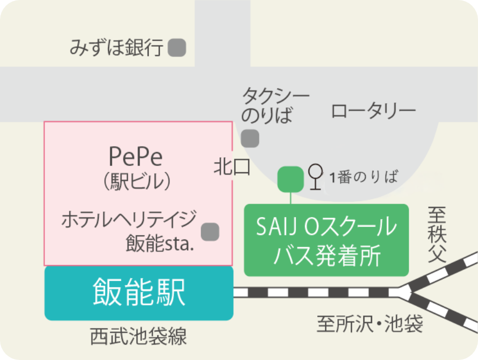 「飯能」駅北口ロータリーに向かって進んでいただき、ロータリー向かって左前に1番バス停がございます。1番バス停の左側にスクールバスが停車します。