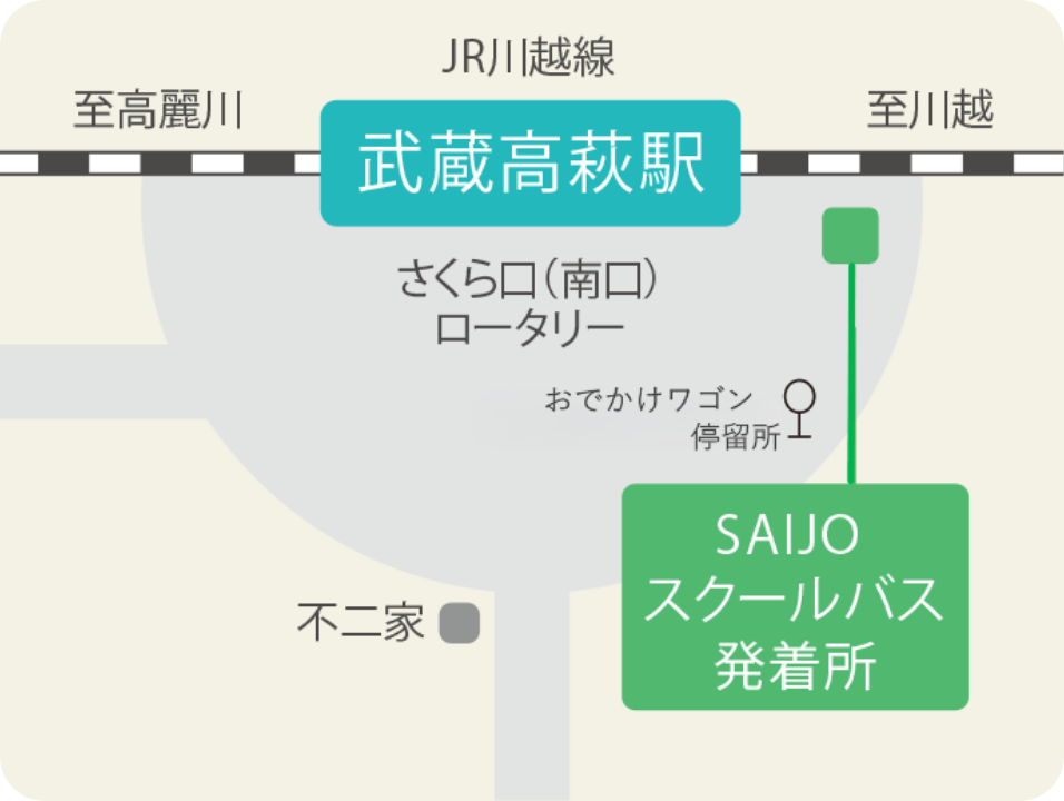 大宮駅もしくは川越駅を経由して武蔵高萩駅からのスクールバスをご利用いただくのが便利です。(スクールバスで約5分)