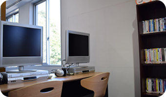 約400本のビデオ・DVDがあります。学生証と一緒にカウンターにお持ちください。なお、館外貸出はしていません。