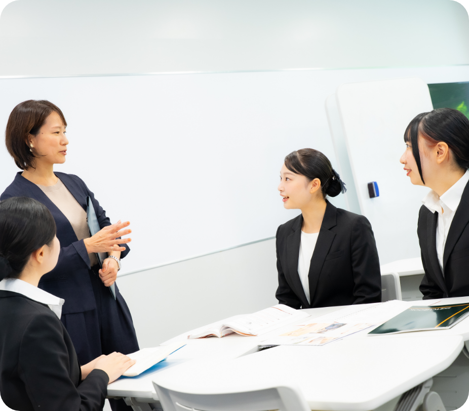 コース別クラス編成による10~20名程度の少人数制で、各業界の第一線で活躍した教員が担当としてつき、学生一人一人の夢をサポートします。